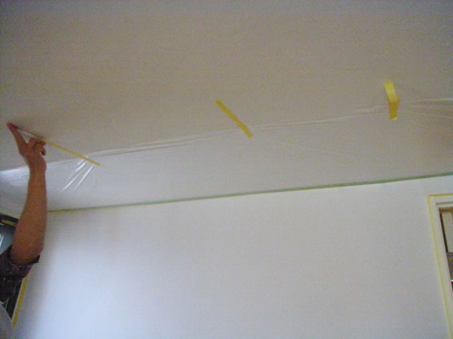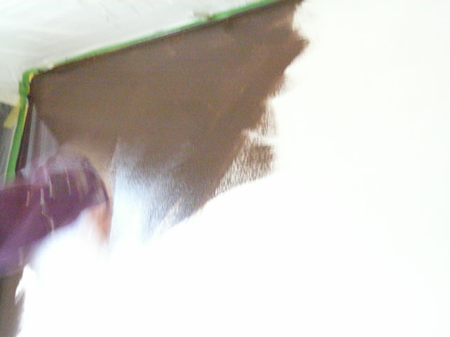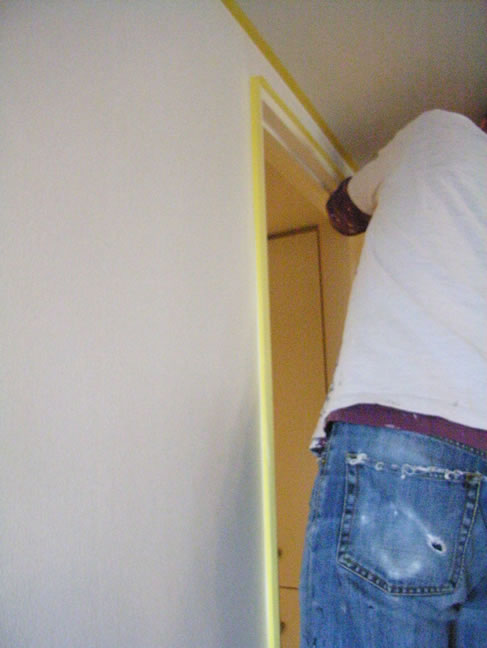 今回、ローラーではなくブラシ塗りなので、それほどペイントは飛び散らないのですが、リノベーションしたばかりできれいな天井や周囲に付かないように、しっかりとマスキングしました。