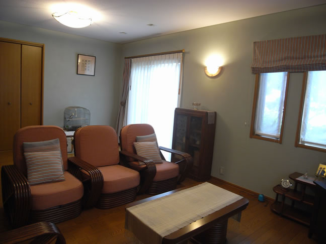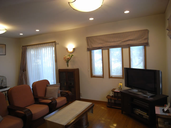 以前から、アンティークやこだわりの家具が揃ったリビングルームだったのですが、それがかえってビニールクロスの軽い雰囲気と、少しはずれていた印象でした。