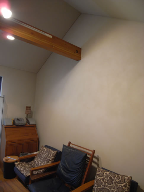勾配のある天井と梁が特徴的なこの部屋には、天井・壁面ともに「EDGE」というニュートラルな色を選びました。比較的おとなしい色ながら、壁面にはSTONE BOLDを使用したので、光を受けて柔らかい陰影が得られ、雰囲気のある壁になりました。