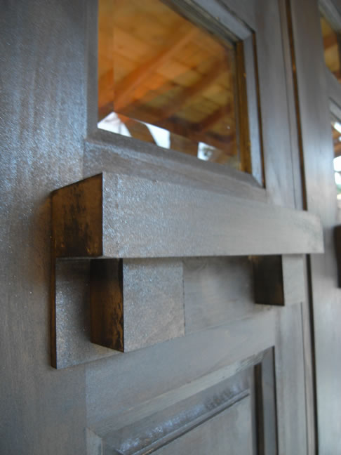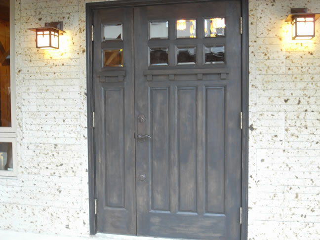 玄関ドアは木製で木目を活かしつつ、ではありますが普通のステイン塗りではつまらない、、、ということでスクエアミーターらしい仕上げを提案。