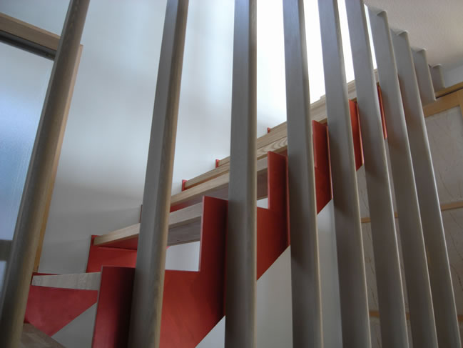 階段のスリットや手摺など、木部はASPRISO LIMEWASH(アスプリッソ ライムウォッシュ)を使った、地味ながら味わい深い特殊仕上げ。木目を活かした仕上げですが、ステイン仕上げなどとは違ったオリジナルです。