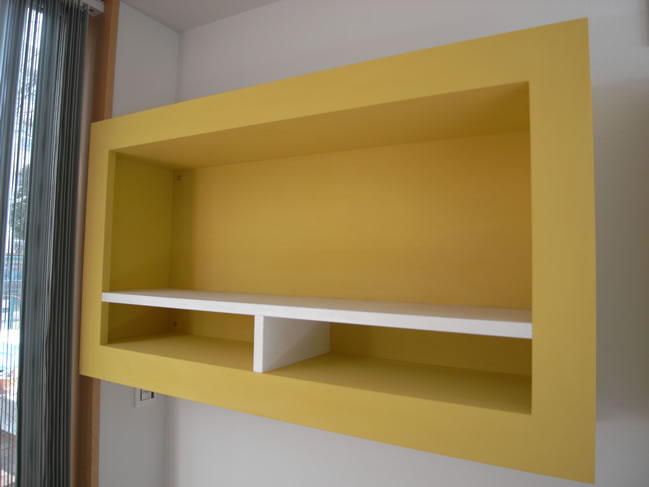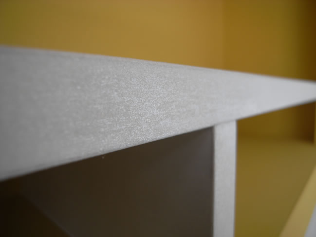 収納棚、黄色の部分は、単色ながら質感があり表面もサラッとしていて耐久性があるということで、STONE INDA(ストーン インダ)を使用しました。そして、白い部分はWHITE DIAMOND(ホワイト ダイアモンド)で仕上げました。