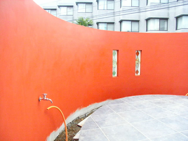 とあるお宅の塀にペイントさせていただいたのは、カバードインペイントのSTONE FINE、色は「GLOWING EMBER」。