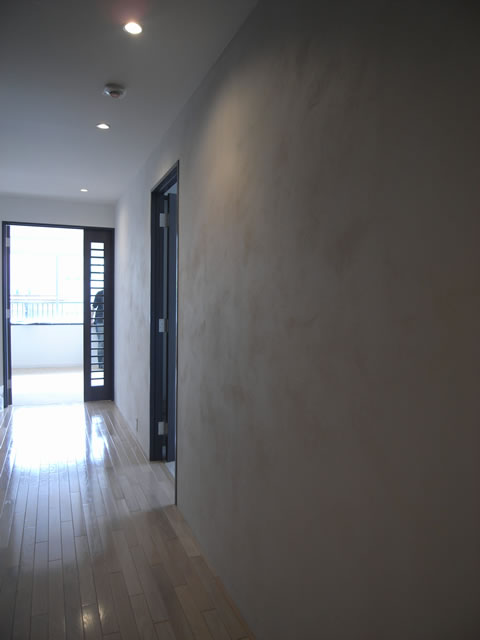 廊下部分の壁面への施工でした。ビニールクロスを剥がして下地調整、ストゥッコで仕上げた上に、さらにワックスをかけ光沢を増します。白や淡い色のストゥッコはとても上品に仕上がるので、今回もモダンな内装にバッチリ合いました。