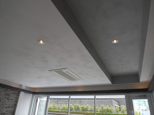 今回、天井・壁面ともカバードインペイントのSTONE COARSE(ストーンコース)、色は「RESOLUTE」を基調に。ダイナミックな陰影を描き、プラスターボード下地とは思えないほどの重厚感が出ました。近くで見ると、こんなにザラザラですが、カバードインペイントSTONEシリーズのグラススフィア効果で、見た目よりも引っ掛りが少ない表面になっています。