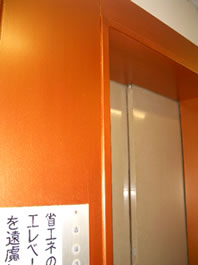 場所は本館、エレベーターのドア周り。元々はアイボリー色のオイルペイント、いわゆるペンキが塗ってあったのですが、プライマー(接着を良くする為の下塗り)を塗ってからコッパーを。