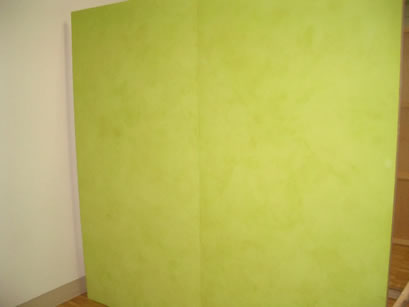 先日、インテリアスタイリストのMさんから声をかけていただいて、カレンダー撮影のお手伝いをしてきました。クリスマスシーズンのリースを掛けるのでなにか表情のある壁を、ということで、カバードインペイントのASPRISO LIMEWASHが採用されました。色は写真のような鮮やかで軽やかなグリーン。