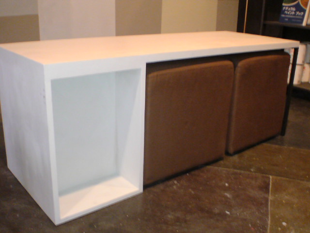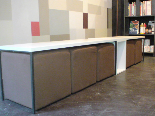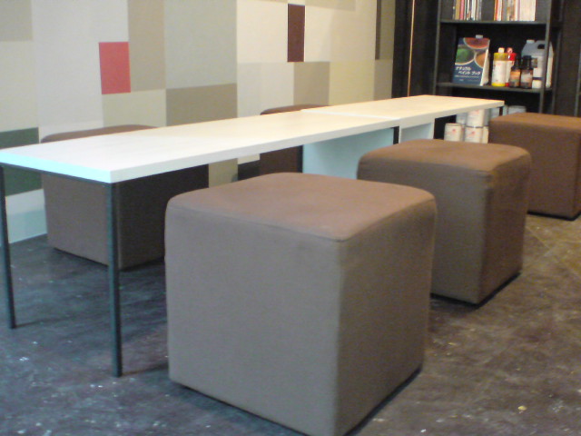 この狭い空間に、なんとか色んな要素を凝縮させて、打合せなども出来るように、ということで、スペースに合わせたテーブルを作ることにしました。