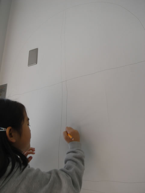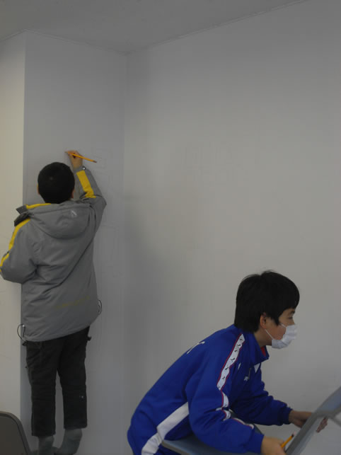 黒板塗料を塗る部分のデザインは、皆に壁に自由に下書きをしてもらい、それに基づいて塗り分けを決めていきます。最初は戸惑っていたこどもたちですが、、、描き始めると、もう止まらない!スゴい集中力と想像力で、1時間以上描き続けました。
