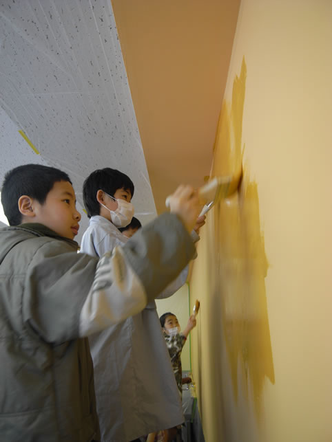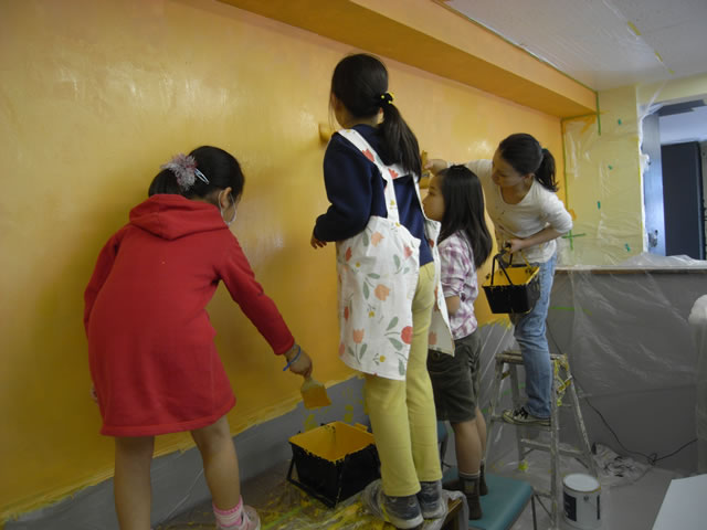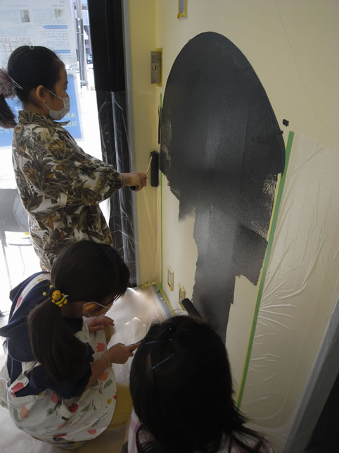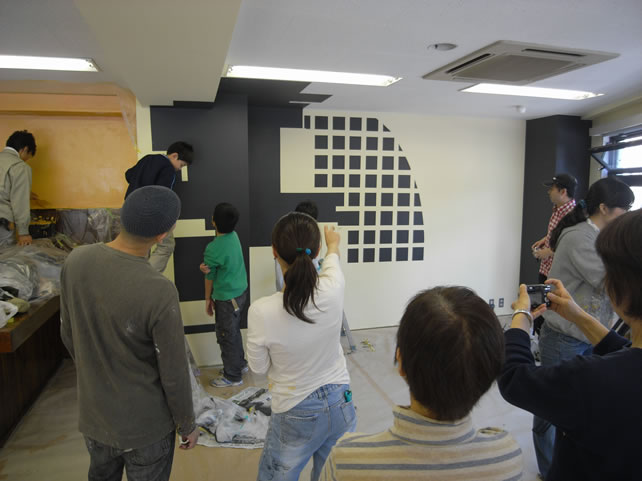 自分たちで実際に体を動かして、マスキングしたり、ブラシやローラーいろんな方法でペンキを塗って、1日で空間をガラリと変えることができる、という感覚を感じてもらえたと思います。手伝った大人たちも、とても楽しく作業をされていて、ちょっとメザメたのかもしれません。。