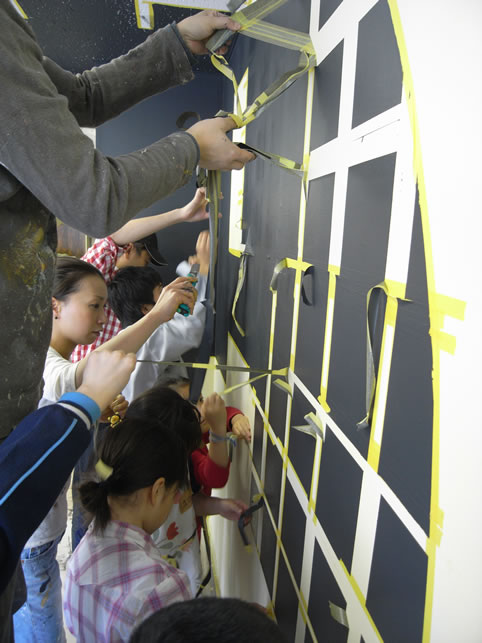 さて、横浜・みなとみらいの象徴的建物「インターコンチネンタルホテル」を模して、マスキングテープでカタチを出した部分を、黒板塗料が乾いてからみんなで剥がしていきます。