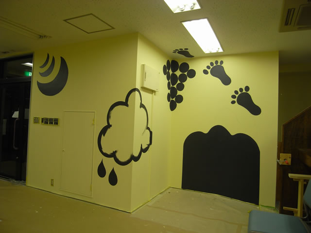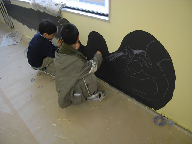 黒板塗料のデザインは、子供達が描いてくれた絵をもとに、黒板の機能が果たせるように再構築してデザインしました。