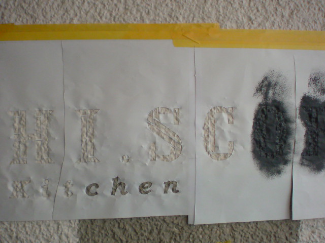 入口付近には、ロゴを描くのですが、、、、ご覧のように凸凹の激しい壁面なので、今回は原稿を印刷した紙を切り抜き、両面テープでしっかりと張り付け、ベタっと塗ると文字が滲んでしまうので、薄塗りを何度も重ねて仕上げていきました。