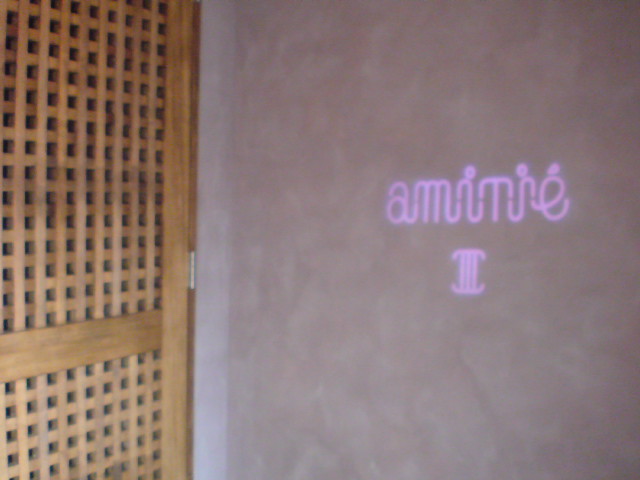 エントランスはこのような格子の木製扉が付き、LEDプロジェクタで壁面に建物の名前である「amitie」が投影されます。