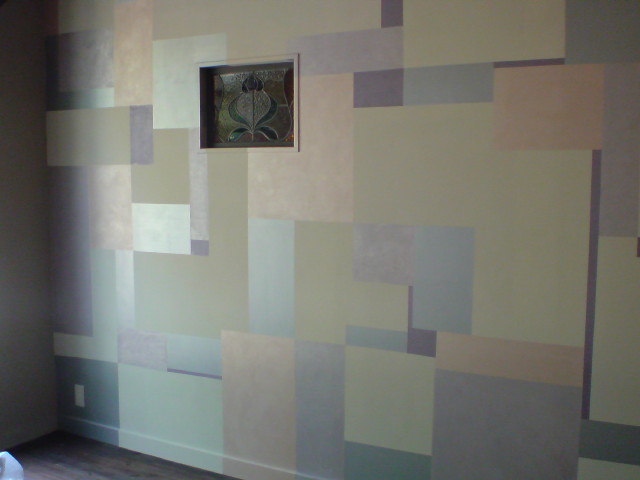 店内も全体的に担当させていただきましたが、写真は後日。一部壁面は、このようなスクエアなデザインで仕上げました。