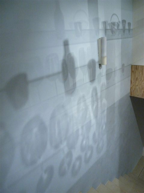 グラスやボトルのうすい影が壁に映って良い感じです。照明や光の当たり方で陰影を醸し出すストーンファインの、季節や時間帯で違った表情を見せてくれる壁面を楽しんでいただければと思います。