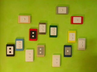 スウィッチってどれも同じでつまらないですよね。壁をペイントするとスウィッチだけ浮いてしまって、一緒に塗ってしまうことも多いんですが、こんなカラフルなモノもあるんです。