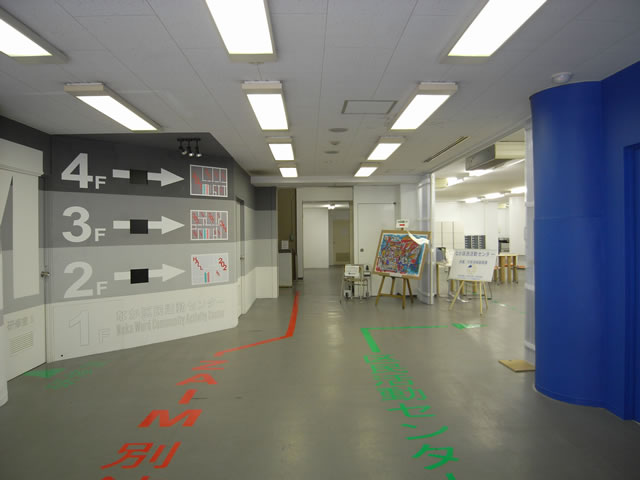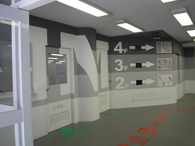 1階の右側部分は横浜市中区で「なか区民活動センター」として利用されていて、横浜市の色「ブルー」となり、ZAIMで使用する左側は、1階から4階までの様子が分かるようにグレーで塗り分けされ、それぞれの説明がカッティングシートと壁に埋込まれたモニターでわかるようになりました。