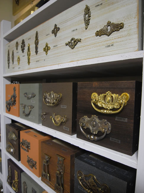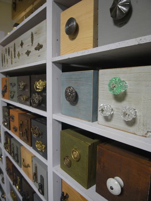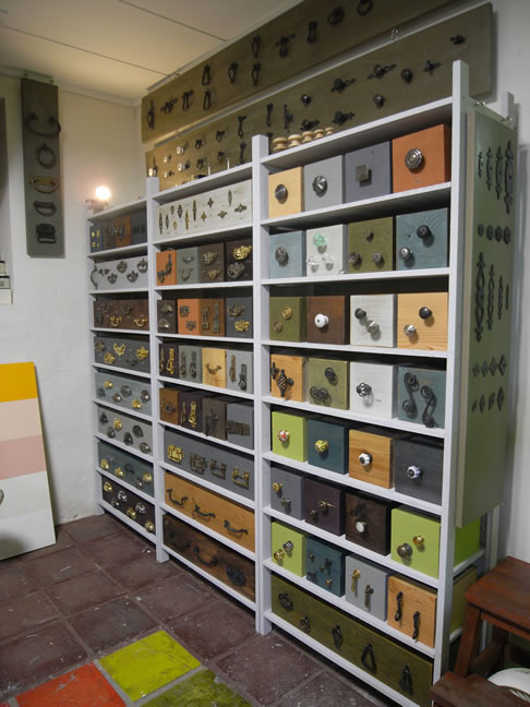 棚に設置したボックスはそれぞれ違うペイント仕上げをしてあります。アンティーク仕上げあり、キラキラ仕上げあり、色も仕上げも様々です。カバードインペイントの小瓶などもあって、とてもカラフルなスペースになりました。